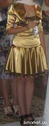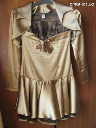 Коктейльное платье в комплекте с болеро. Было одето один раз. Цвет золотистый. Нижняя юбка и отделка бюста - черное кружево. Корсет на шнуровке. Размер М (44-46). |