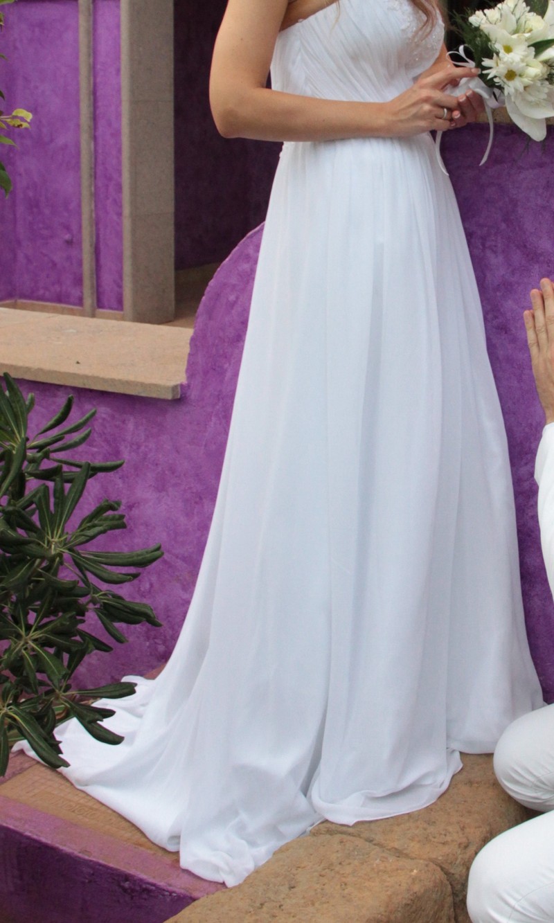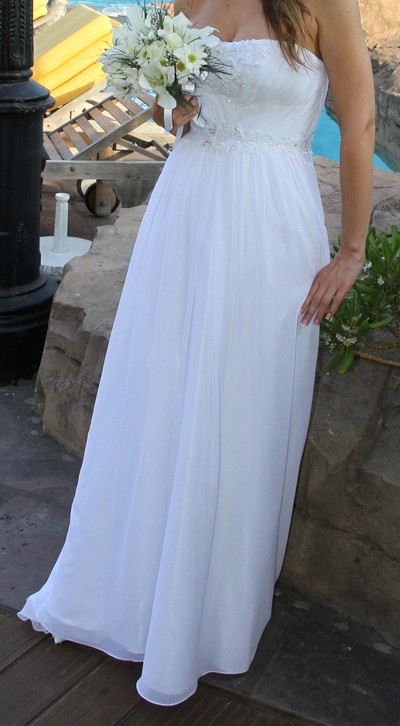 Платье в стиле ампир (салон Медовый Месяц), р. 42 ( -) (s-m), цвет белый. Не венчанное. Одевала один раз, в идеальном состоянии (не требует химчистки, так как одевалось на пару часов для церимонии на Канарских островах). Состоит из двух слоев, с изысканным шлейфом, сзади шнуровка. На рост 160-170 см каблук. (Подходит девушкам в положении. ) |