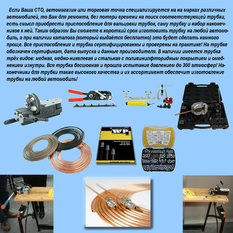 Тормозные и гидравлические трубки, продажа и изготовление. Устройства для изготовления трубок и принадлежности к ним. Тормозные шланги и саморегулирующиеся распорные планки. Соединители и редуктора, тройники и штуцеры. Трубка в бухтах из разного материала и различного диаметра а также наконечники к ней. Ремкомплекты к суппортам и тормозным барабанам. |