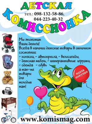 Современный детский комиссионный магазин(детская комиссионка),расположен в г.Киеве на Левом берегу в непосредственной близости с Ленинградской площадью. Основная специализация магазина- продажа детских товаров б/у-у нас в наличии всегда имеются детские коляски б.у. в большом ассортименте,кроватки,стульчики для кормления,манежи,велосипеды,ходунки а так-же развивающие игрушки , детская одежда и обувь. . Все вещи предлагаемые в нашем магазине в очень хорошем состоянии! Более подробную информацию Вы получите позвонив по телефону. Контакты: Адрес.г.Киев,Харьковское шоссе 19.тел.050-7717-087 098-132-58-86 |