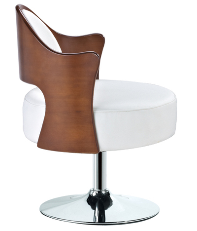 Кресло, внешняя сторона изготовлена из дерева, оббивка в кожзаме белого цвета, дерево покрыто лаком, основание поворотное, не регулируется по высоте, хромированное, размер 58*50*77, высота сиденья 43-54. |