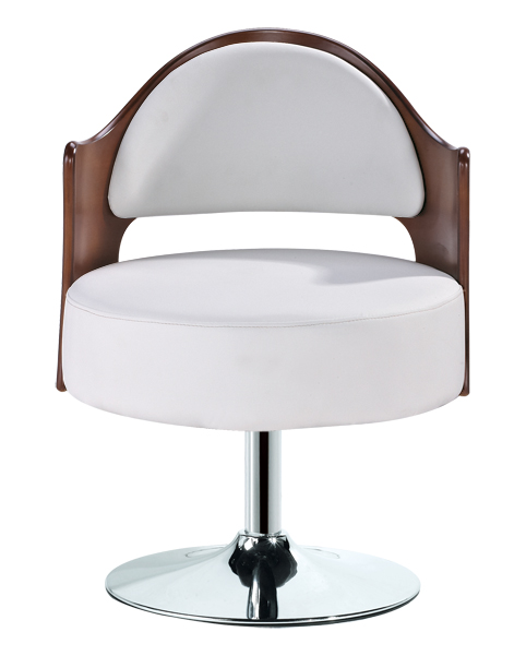 Кресло, внешняя сторона изготовлена из дерева, оббивка в кожзаме белого цвета, дерево покрыто лаком, основание поворотное, не регулируется по высоте, хромированное, размер 58*50*77, высота сиденья 43-54. |