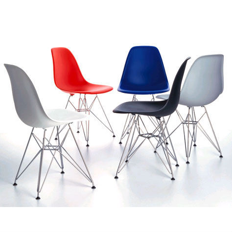 Стул из монолитного пластика, ножки хромированные, 54*46,5*80,5. Разработан в 1948 г. дуэтом Рэя и Чарльза Имз, обеденный стул стал победителем в нью-йоркском музее на конкурсе современного искусства международного «Low-Cost Furniture Design». |