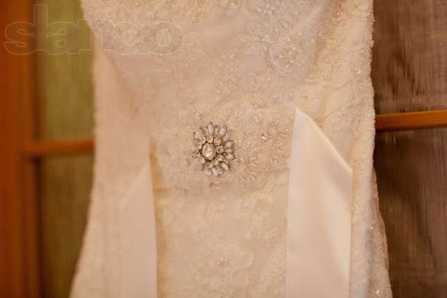 Свадебное платье Splendide Feerie Pronuptia 2012 года. Рыбка. Кружевное. Красиво выделяет фигуру. Очень удобное, в нём можно и танцевать, и прыгать, ничего не давит. Очень стильное платье. Кружево придаёт ему особую красоту. Сзади - молния. |