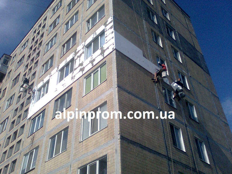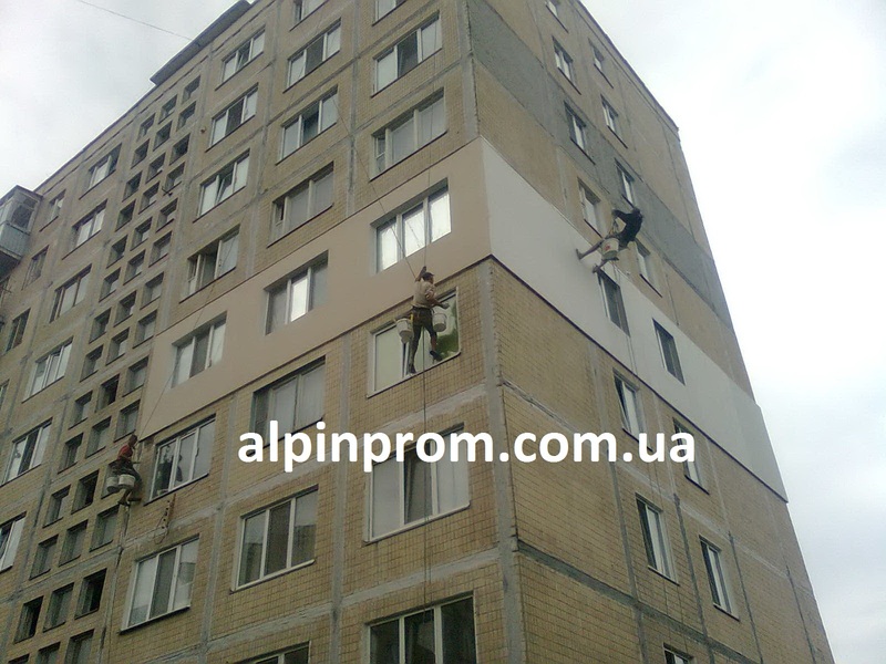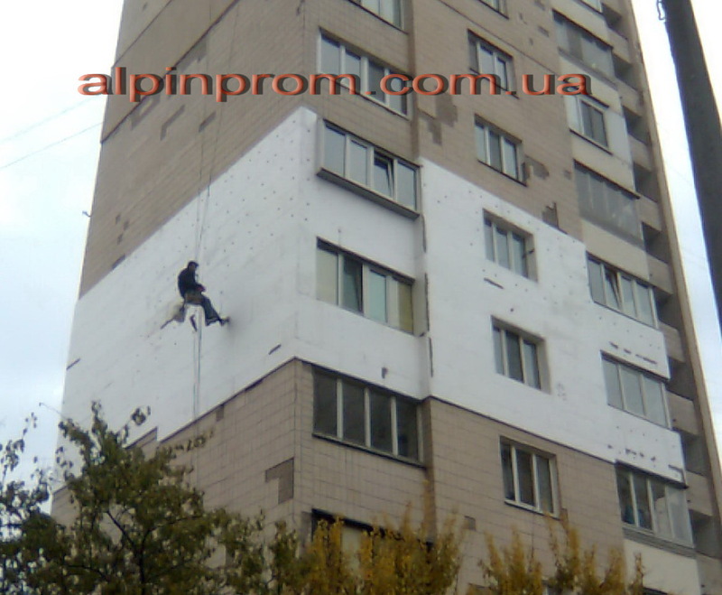 Мы выполняем наружное утепление фасадов методом промышленного альпинизма мокрым способом.