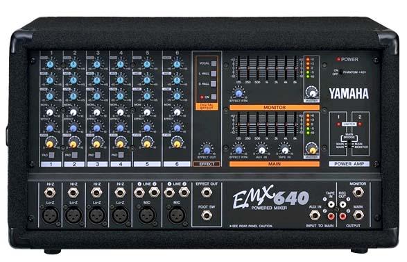 Усиливающий микшер Yamaha EMX-640, с двумя усилителями, мощностью 200 Вт каждый обеспечивает прекрасные возможности микширования и обработки звука, отличные параметры выходов на акустические системы, максимум свободы творчества и, конечно же, непревзойденное качество звука, характерное для аппаратуры Yamaha. EMX 640 имеет шесть каналов с двухполосными эквалайзерами, регуляторами мониторного уровня и уровня посыла на процессор эффектов (встроенный или внешний), регуляторами уровня. имеет шесть каналов с симметричными микрофонными входами (XLR), фантомным питанием (48 В), трехполосными эквалайзерами, регуляторами мониторного уровня и уровня посыла на процессор эффектов (встроенный или внешний), регуляторами уровня. На первых четырех каналах есть также аттенюаторы и симметричные входы на джеках. Канал 5 имеет два линейных входа, а канал 6 — два высокоомных инструментальных входа, все на джеках.