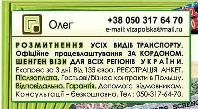 Візи ШЕНГЕН по Всій Україні. Реєстрація on-line анкет. Відповідально. Післяоплата. Допомога відмовникам. Розмитнення Усіх видів транспорту. Отримання шенгенської візи . Консультації – безкоштовно. Одержати шенгенську визу по Тел.: 050-317-64-70 Олег |
