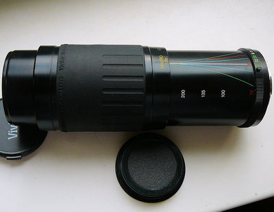 Vivitar 70-300 1:4,2-5.8 MC Macro focusing zoom, Pentax A. Eсть положение кольца установки диафрагмы "А" для управление диафрагмой с тушки, работает матричный замер. Конструктивно выполнен в виде "Трамбон" - одно кольцо зума и фокусировки.Минимальная дистанци фокусировки 1,5м. Резьба под фильтр 55мм. http://pentax.at.ua |