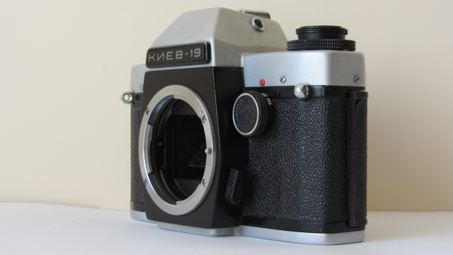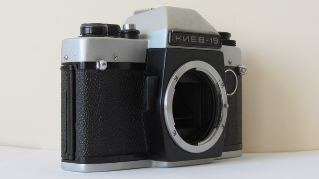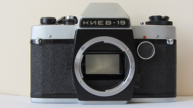 КИЕВ-19-малоформатный зеркальный фотоаппарат системы ТТЛ с полуавтоматической установкой экспозиции.