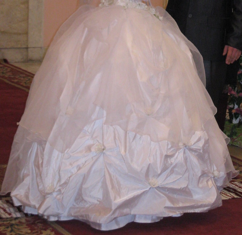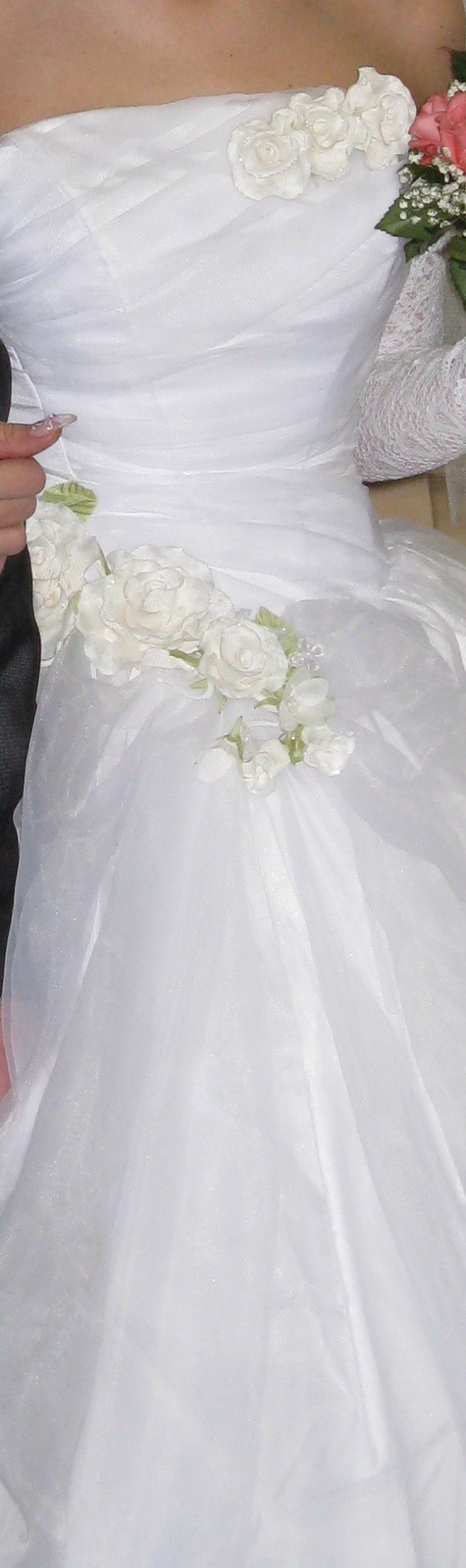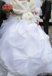 Продам недорого свадебное платье, цвет: белый, материал: шифон на сжатом атласе, расшит розочками, на корсете. В подарок-меховая накидка! |