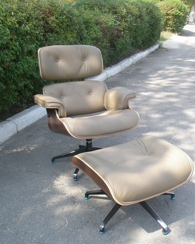 Кресло шезлонг с оттоманкой, респектабельный комплект, изготовлен из формованной фанеры и кожи, кресло состоит из трех изогнутых фанерных корпусов, изготовленных из тонких слоев деревянного шпона, формованных при помощи температуры и давления, крестовина черного цвета, кресло поворотное, подлокотники широкие, спинка высокая с подголовником. Копия дизайна 1955 г. известных архитекторов Чарльза и Рэй Имз - один из классических образцов мебели XX века, сочетает в себе максимальный комфорт с высоким качеством материалов, изготовления и дизайн. Размеры: кресло: 96*100*63, отоманка: 65*26*57. |