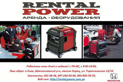 Компания “Rental Power” предлагает уличные генераторы на прокат на бензиновом двигателе HONDA на выгодных условиях в Киев и Киевской области. Беззалоговая аренда бензогенераторов, доставка оборудования, установка, подключение, заправка бензином.