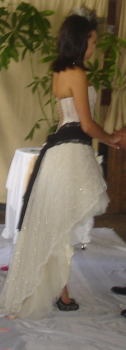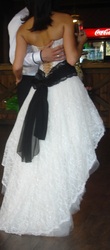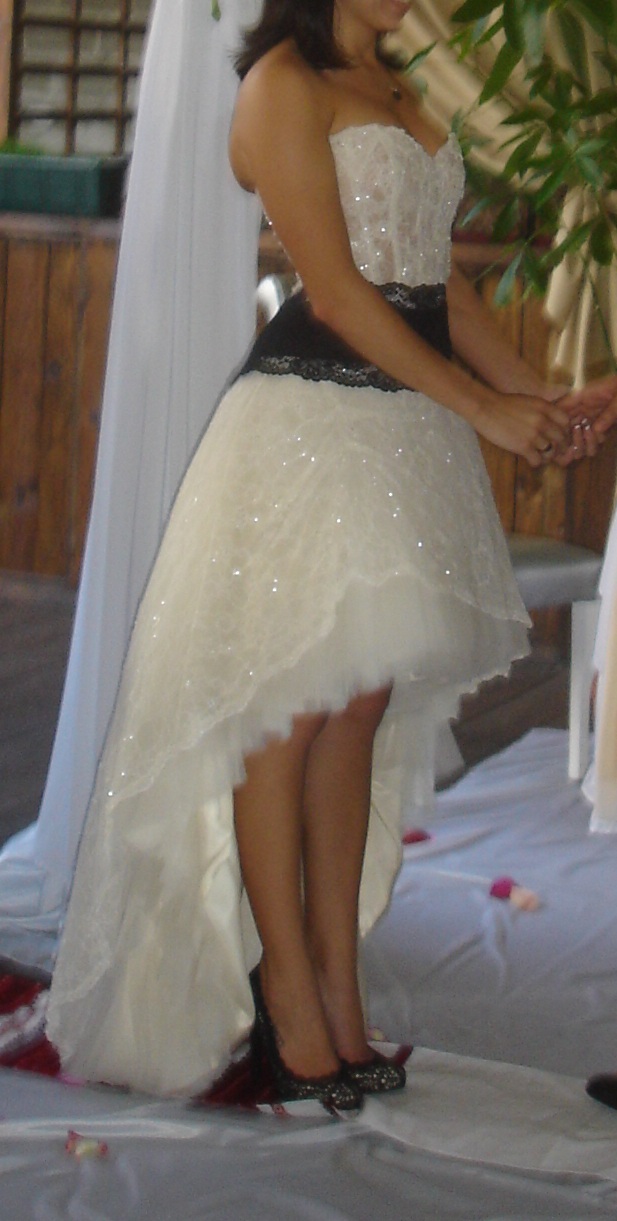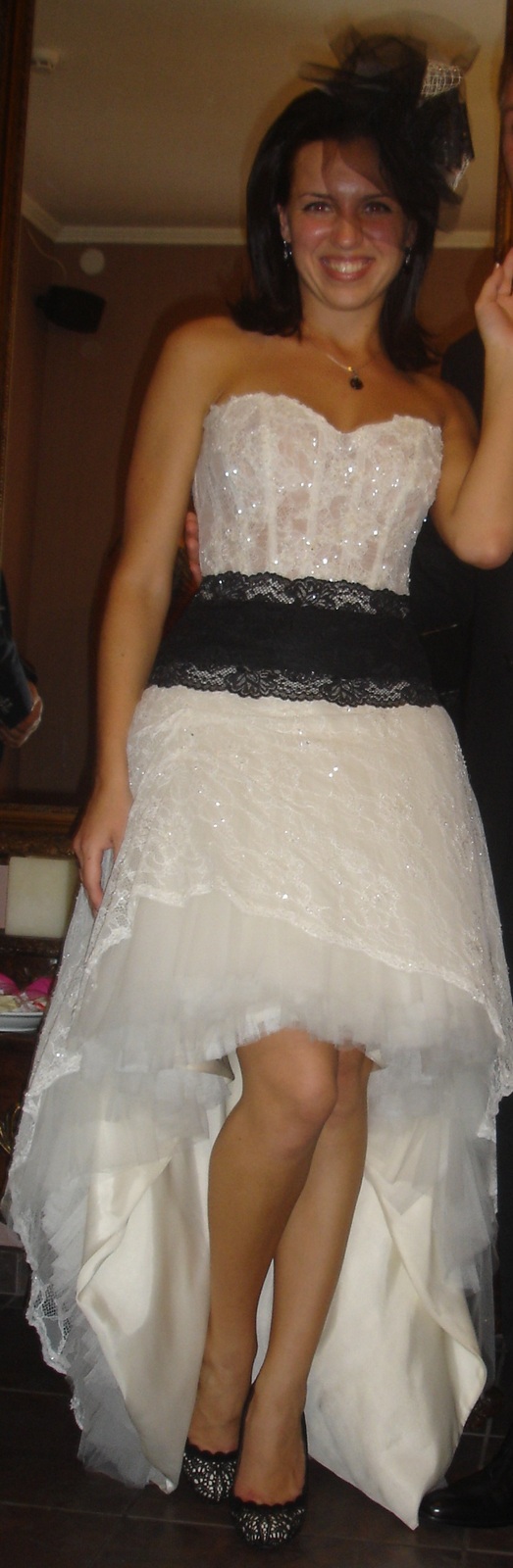 продам свадебное платье из коллекции Татьяны Григ "Амелия". куплено, одето единожды. спереди укороченное, сзади в пол. использовала его вместе с черным кружевным поясом и ободком в тон из фатина. приобретение платья с поясом и ободком - по желанию. |