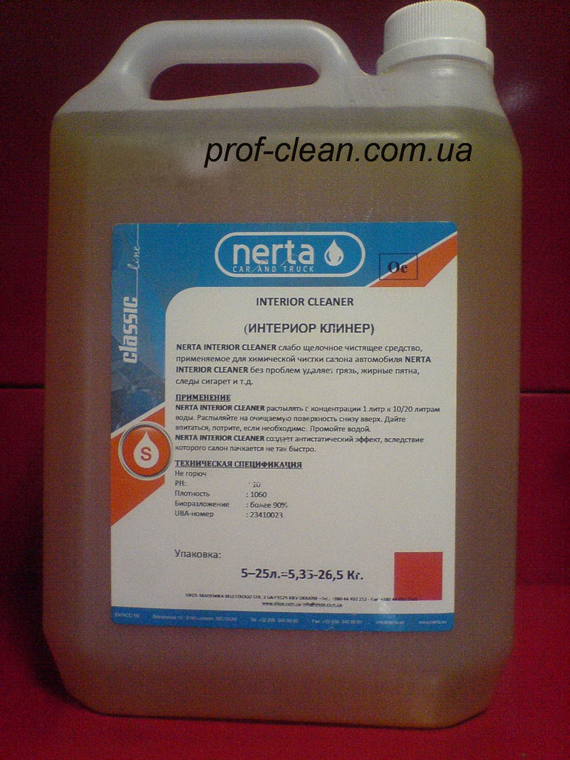 Nerta interior cleaner сильноконцентрированное, щелочное, очищающее средство. Применяется для химчистки ковровых покрытий, мягкой мебели и салонов автомобилей пятен и других загрязнений. Применяется для химчистки любых ковровых покрытий, химчистки велюра, пластика, винила, кожи и т. д. После применения не оставляет разводов и белых пятен. Способ применения: Ручной способ: Наносится на поверхность разведенным в концентрации от 1:10 до 1:20 (в зависимости от степени загрязнения) через ручной или автоматический распылитель. Затем поверхность очищается щетками и химическое средство вымывается водой с помощью моющего пылесоса. Моющим пылесосом: используется с моющим пылесосом согласно инструкции к пылесосу по работе в режиме химической очистки поверхности. Разводится в концентрации от 1:10 до 1:20 (в зависимости от степени загрязнения) Для достижения максимального эффекта лучше разбавлять теплой водой 50° С. Внимание: Не допускать высыхания на поверхности. Техническая спецификация: • Не содержит ядов. • Не воспламеняется. • рН: 10 • S.G.: 1060 • Биологическое разложение: более 90% • Поставляется в канистрах емкостью: 5 л.