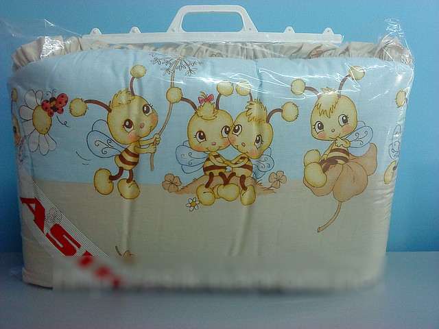 Бортики раздельные, по всему периметру кроватки. Ткань — 100% хлопок, наполнитель — синтепон плотностью «400». Длинна 360см., высота 33см. Подходит также на кроватку с опускающейся боковиной, так как состоит из 3-х частей (60-120-180 см).