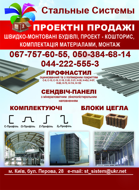 Завод стеновых и кровельных материалов производит и предлагает свою продукцию : СЕНДВИЧ ПАНЕЛИ стеновые и кровельные с минватой и пенополистеролом для быстромонтируемых сооружений. ПРОФНАСТИЛ - 32 прокатных стана - С8,С10,ПР15,Н20,Н35,Н45,Н57,Н60,Н75 и другие. МЕТАЛЛОЧЕРПИЦА типа Монтереей и Скандинавия с полной комплектацией кровли и стены. ПРОФИЛЯ для прогонов типа С, омега, зет, уголок и другие. БЛОК и КИРПИЧ рядовые и декоративные. Вся продукция сертифицирована в УкрСЕПРО. |