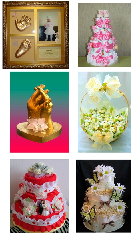 Оригинальные, красивые и эксклюзивные подарки ручной работы на дни рождения, юбилеи, свадьбу, выписку из роддома, крестины, смотрины, семейные и детские праздники, а также другие важные для Вас и Ваших близких, друзей события! Хочется не быть банальным в выборе подарка и подарить что-то особенное, красивое и неповторимое, подарок, который запомниться надолго, а о дарителе будут вспоминать с благодарностью!!! Предлагаем Вам оригинальные и неповторимые подарки ручной работы: - Слепки детских ручек и ножек - Слепки рук влюблённых и молодожёнов - Торты из памперсов - Торты из полотенец или постельного белья - Букеты из детской одежды НАШИ ПРЕИМУЩЕСТВА: -Лучшие Цены! На любой кошелек: от бюджетных вариантов до премиум услуг; -Скидки и акции!; -Качество товаров и неповторимость!; -Минимальные сроки изготовления!; -Индивидуальный подход к каждому клиенту!; -Дополнительные услуги по оформлению подарков и подбору поздравительной открытки!; -При каждом заказе – ПОДАРОК-СЮРПРИЗ!; -Доставка готового изделия!; -Оплата как наличными, так и по безналичному расчету!; -Дарим позитивные эмоции:)))! Индивидуальный подход к каждому заказчику и эксклюзив гарантирован!!! Подробнее на сайте: viola-s.com.ua Тел.: 066-154-80-28, 098-661-83-80, 383-69-17 Ольга