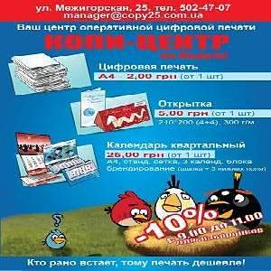 Копировальные и полиграфические услуги на Подоле. Копи-центр на Подоле предлагает: Цветная и черно-белая ксерокопия. Копирование, сканирование, ламинирование документов, фотографий … до А3. Визитки: цифровая печать, односторонние, двухсторонние, цветные и черно-белые. Печать фотографий, конвертов, бланков, календарей, наклеек, буклетов, брошюр, листовок. Переплет (твердый, мягкий). Пост печатные услуги. Маргарита +38(044)5024707 Киев, Межигорская, 25 manager@copy25.com.ua |