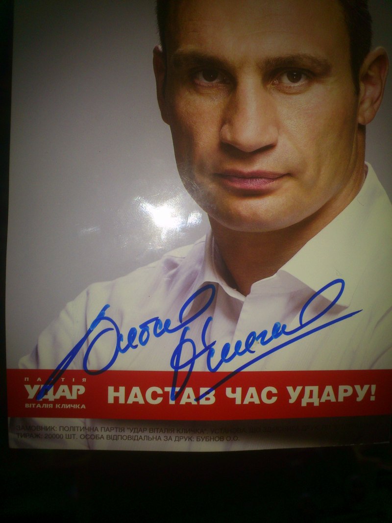 Продам автограф Виталия Кличко. Расписывался лично он сам на своём фото 25-го октября когда приезжал на Троещину с целью предвыборной агитации. Возможен торг. |