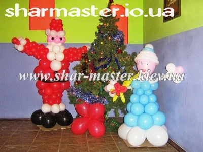 - яркие букеты из шаров в зимней цветовой гамме, с новогодними надписями-поздравлениями и рисунками;