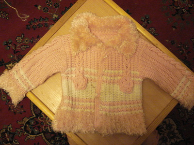Кофта вязанная для девочки 1-2,5 года. Тепленькая, розового и белого цветов с цветочками, с пушистым воротником, низом рукава и низом кофты, состояние хорошее. Рукав от плеча 27 см., по спинке 33 см. |
