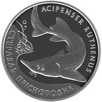 Стерлядь пресноводная (Стерлядь прісноводна) Посвящены исчезающему виду семейства осетровых — стерляди пресноводной — придонной рыбе, которая занесена в Красную книгу Украины. Серия:Флора и фауна Номинал 10 грн Серебро 925 |