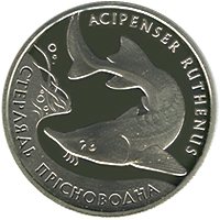 Стерлядь пресноводная (Стерлядь прісноводна) Посвящены исчезающему виду семейства осетровых — стерляди пресноводной — придонной рыбе, которая занесена в Красную книгу Украины. Номинал 2 грн, нейзильбер |