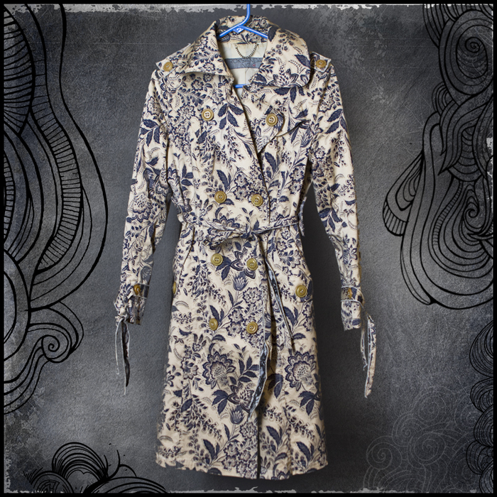Плащ с цветочным принтом. Двубортный под пояс. Рукава декорированы гипюровыми завязками. Длина 93см Длина рукава 57,5см |
