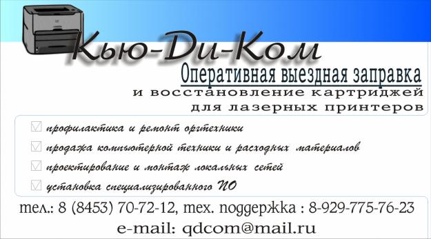 Уважаемые Дамы и Господа! Компания Кью – Ди – Ком поможет решить следующие проблемы: • Заправить и восстановить картриджи для лазерных черно-белых и цветных принтеров, копировальных аппаратов НА ТЕРРИТОРИИ ЗАКАЗЧИКА. • Профилактика и ремонт оргтехники (принтеры, ксероксы (копиры), ризографы, компьютеры) • Продажа, поставка компьютерной техники. • Поставка расходных материалов (картриджи, тубы) . • Проектирование и монтаж локальных сетей, в том числе на основе Wi Fi оборудования. • Установка специализированного программного обеспечения . Всё это наши специалисты проделывают у вас на месте. Наш диспетчер с радостью примет ваши заказы по телефону (8453) 70 – 72 – 12 Техническая поддержка 7 (929) 775 76 23 ориентировочная стоимость заправки вместе с выездом 200 рублей. более подробная информация на нашем сайте http://qdcom.ru Почему работать с Нами выгодно: Заправка картриджей • Наш мастер выезжает даже для заправки 1 картриджа. • Оперативность реагирования. Мы заправим Вам картридж уже через 2 часа после вызова мастера. • Гарантированное качество заправки. • Никакой предоплаты. Оплата по факту выполнения работ. • Большие партии картриджей постоянно сопровождаются скидками на их заправку. Ремонт оргтехники • Мы БЕСПЛАТНО предоставляем клиентам для использования принтеры из собственного парка подмены взамен техники нуждающейся в ремонте (на весь срок ремонта). • Гарантия на все виды работ. • Возможность заключения договора на ежемесячное техническое обслуживание копировальной техники. Самое Оперативное, выездное обслуживание, Всегда хорошие, приятные цены, Гарантия на все проделанные работы. С уважением и надеждой на плодотворное сотрудничество =) |