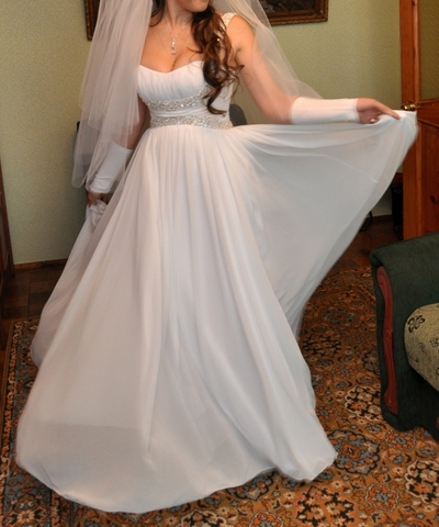 Продам изысканное свадебное платье в греческом стиле. Платье белоснежное, после чистки, в отличном состоянии. Было в использовании только 1 раз. Мой размер 38 европейский, но подойдет девушкам в большем и меньшем размере. Фасон платья подойдем девушкам любой комплекции. Прямой силуэт, сзади шнуровка, расшитое бусинками. Платье на рост до 174см. Идеально подходит также невестам в положении. К платью прилагаются перчатки в подарок. Торг уместен. |