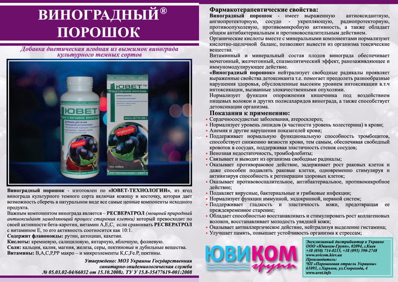Виноградный порошок из ягод винограда культурного темных сортов, антиоксидант прямого действия обладает такими фармакологическими свойствами: