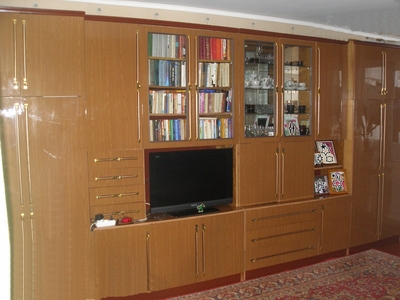 Стенка "Фобос", б/у, в хорошем состоянии, Цвет –ольха (светлая), полированная, на 4 секции. Длина 4,45 метра, Высота 2,22 метра. Первая секция: платяной шкаф 2-х створчастый с антресолями, ширина 88 см глубина 58,5 см. Вторая секция : закрытые полочки(4 полки), 3 выдвижных ящика и нижний антресоль, книжный шкаф и открытая полка ( можно под телевизор) и нижний антресоль 2-х створчатый; глубина секции 35,5 см. Третья секция: сервант с баром и комодом с тремя выдвижными ящиками, закрытые полочки (4 полки) и открытая полка с нижним антресолем, глубина секции 35,5 см. Четвертая секция: платяной шкаф 2-х створчастый с антресолями, ширина секции 58,5 см . Все секции стенки можно ставить как в ряд так и отдельно. Цена 1600 грн (торг уместен), Самовывоз Киев р-н м. Минская ул. Полярная тел: 462-32-90, E-maill: piramidaхр@mail.ru