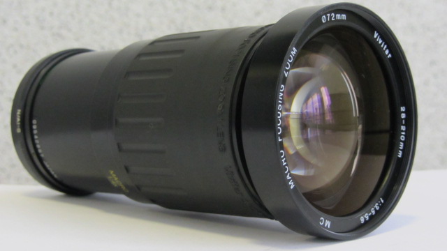 Vivitar 3,5-5,6/28-210 MC MACRO FOCUSUINC+ZOOM — 2,5-кратный трансфокатор, охватывающий диапазон фокусных расстояний наиболее часто применяемых длиннофокусных объективов. В процессе съемки обеспечивает возможность выбора любого фокусного расстояния в диапазоне от 28 до 210 мм. Благодаря этому можно точно расположить фотографируемый объект в кадре, не перемещая фотоаппарат в другую точку съемки, что особенно удобно при репортажных съемках при работе с обращаемой пленкой.