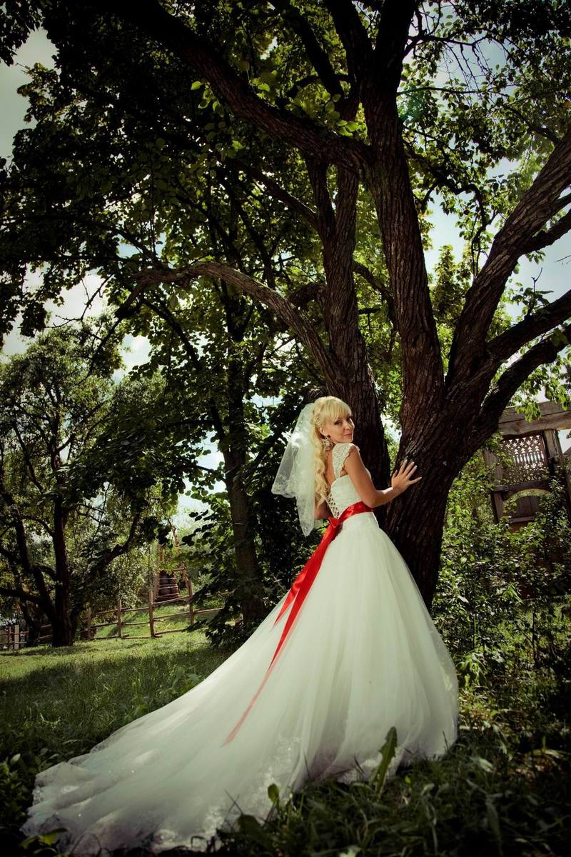 Атласный корсет платья расшит кристаллами Сваровски и бисером. По центру корсета – красная шёлковая лента (2 м.), которая завязывается на спине красивым бантом. Подол платья , длиной 1,5 м. выполнен из лёгкой шёлковой ткани и расшит по низу кристаллами Сваровски и бисером. При необходимости подол можно подстегнуть на скрытые крючки. Корсет на шнуровке. Сьёмные кружевные плечики-крылышки крепятся на маленькие кнопки. Платье идеально подойдёт стройным девушкам ростом 163-173 см.+высота каблука. За счёт шнуровки размер платья может варьироваться от42 до 44 украинского размера. Возможен торг.
