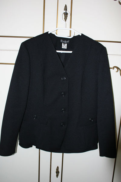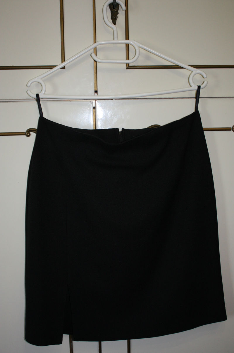Костюм черного цвета б/у. Размер 48(наш). Длинна юбки 52 см, небольшой разрез(шлица) справа. |