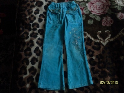 Очень красивые вельветовые брюки на девочку.В идеальном состоянии,без потертостей,низ не обтрепан.Расшиты серебряной ниткой и паетками,выглядят очень классно.На этикетке написано 9-10 лет,но на самом деле лет на 7-8.Даю замеры:от пояса до низа-74 см,длина по внутреннему шву-51 см. |