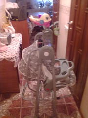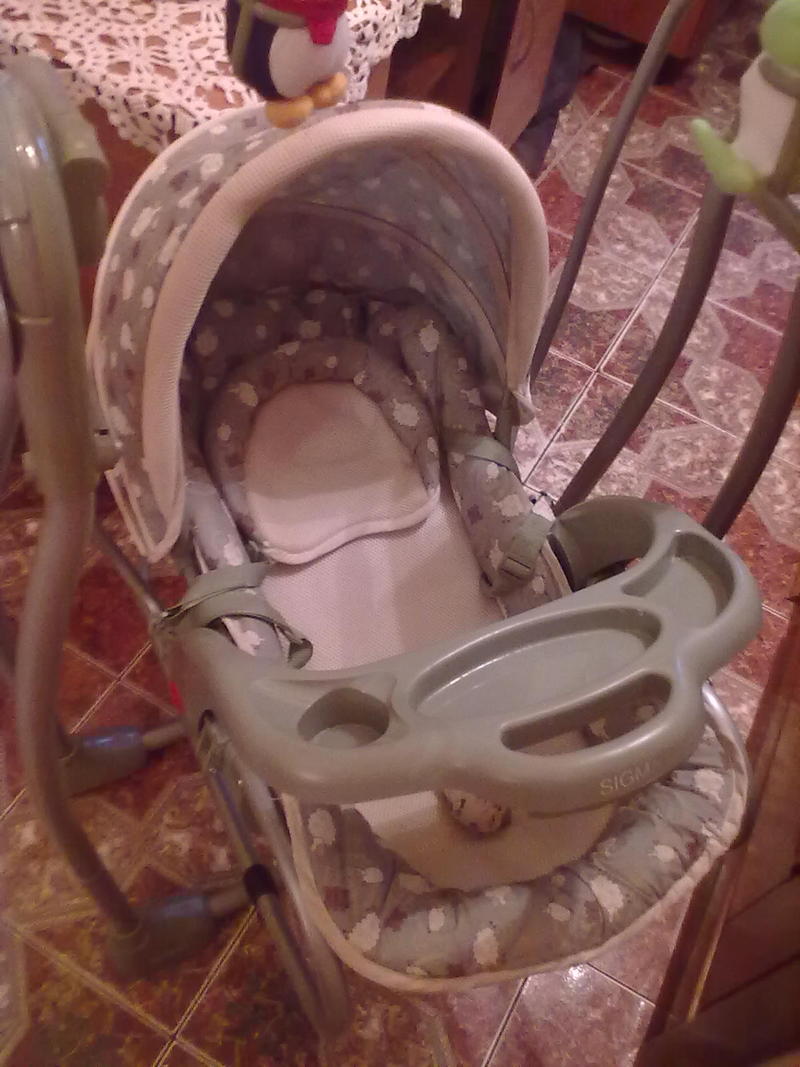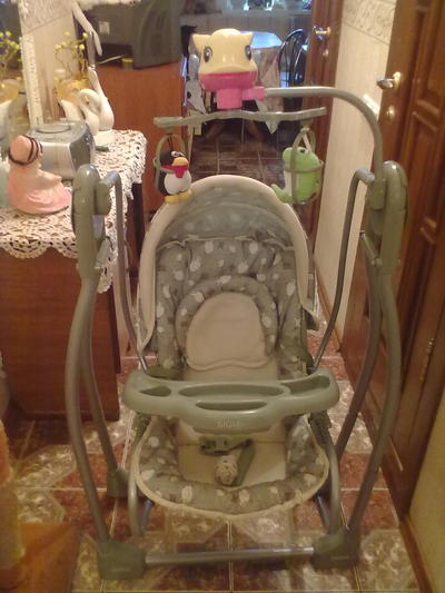 Кресло в отличнос состоянии,игрушки крутяться,рыбка вверху светиться,музыкальная,музыка в 3-х режимах до полного выключения.Качает от батареек в 3-х режимах.Спинка поднимаеться в 4-х положениях.Можно с рождения,качает самостоятельно до 12 кг,трёх точечные ремни безопасности.Не составит большого труда снять кресло и сделать шезлонг для ребёнка постарше,шезлонг тоже можно качать ногой. или кресло для кормления.Батареек хватает на долго.Есть подставка для бутылочки.Очень большая помощь для мамочек.Меня она просто спасала.В подарок отдам слинг пользовались только один раз. |