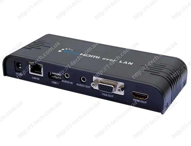 Ставим софт на Ваш ПК. Соединяем системный блок с устройством с помощью обычного интернет кабеля (RJ45) длинной до 200 метрв (100м.-роутер/свитч-еще 100м.) на выходе получаем HDMI (1080p) или VGA, звук (jack 3.5), микрофон (jack 3.5) и два USB 2.0 для подключения клавиатуры и мыши.