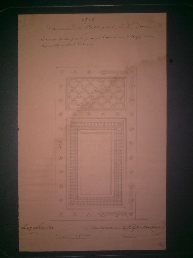 Архитектурный эскиз, выполнен карандашом на плотной бумаге, имеется пояснительная записка на французском языке чернилами и личная подпись архитектора Исакиевского собора в Санкт-Петербурге Огюста Монферана, 1856 год. |