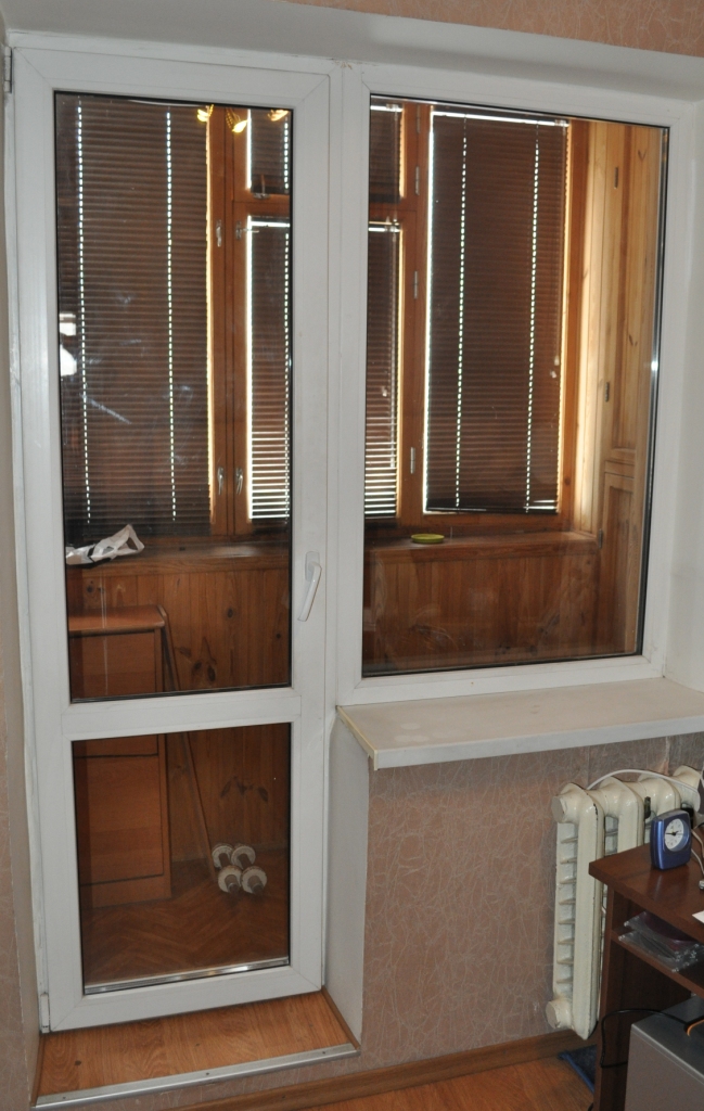 Пластиковое окно с дверью для выхода на балкон из маленькой комнаты 3-х комнатной квартиры панельного дома серии 96. Размеры: окно глухое 140х86см, дверь 68х200см. |