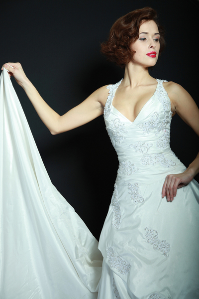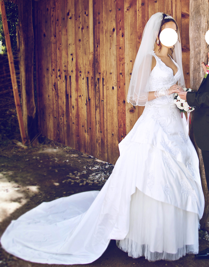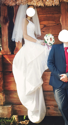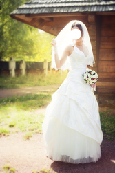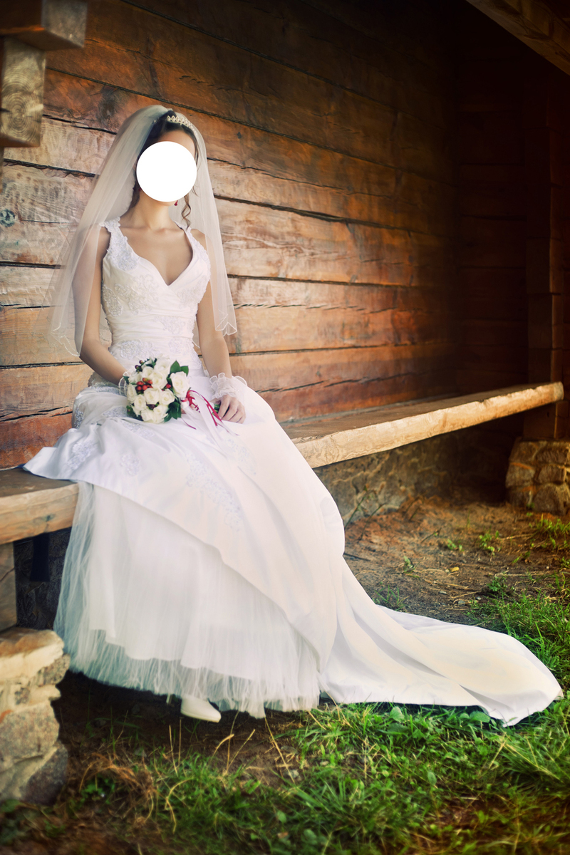 Платье не мнется, очень удобное и легкое. Корсет с косточками, добротно пошит, вышит стразами. Вырез корсета прекрасно подчеркивает грудь даже небольшого размера, визуально ее увеличивая. Ширина талии регулируется лентами на корсете со спины. Бретельки вышиты стразами, крепятся прямо или накрест по спинке. Шлейф платья можно распускать или закалывать на пуговку из жемчуга.