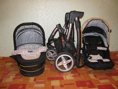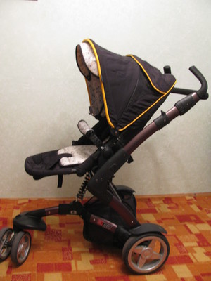 Подножка регулируется. Прогулочный блок снимается с шасси с помощью нажатия 2-х кнопок. Большой капюшон оснащен смотровым окошком для присмотра за малышом и складывающемся козырьком от солнца. Коляска входит в лифт, а также очень удобно складывается.
