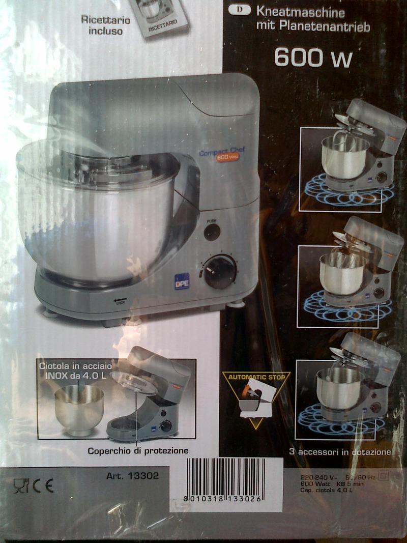 Продам кухонный комбайн (тестомес) DPE COMPACT CHEF новый. Смеситель с планетарной траекторией движения венчика, 6-скоростной регулятор скорости + импульсный режим. Идеально подходит для замеса теста для хлеба, замеса тортов, кондитерских, макаронных изделий и т. д.. В комплекте 3 аксессуара: крюк для густого теста (для замеса теста для пасты), шарообразный венчик (для приготовления безе, взбивания яиц), V-образная насадка (для приготовления пюре, песочного теста, перетирания сухарей). Также в комплект входит 4-литровая чаша из нержавеющей стали с защитной крышкой. Товар куплен в Италии. Штрих-код №8010318133026. |