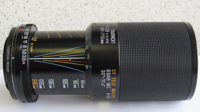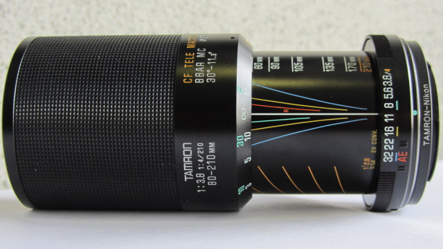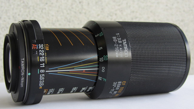 TAMRON BBAR MC 3,8-4/80-210 CF TELE MACRO+ZOOM на Nikon.(Япония) — 2,5-кратный трансфокатор, охватывающий диапазон фокусных расстояний наиболее часто применяемых длиннофокусных объективов. В процессе съемки обеспечивает возможность выбора любого фокусного расстояния в диапазоне от 80 до 210 мм. Благодаря этому можно точно расположить фотографируемый объект в кадре, не перемещая фотоаппарат в другую точку съемки, что особенно удобно при репортажных съемках при работе с обращаемой пленкой.