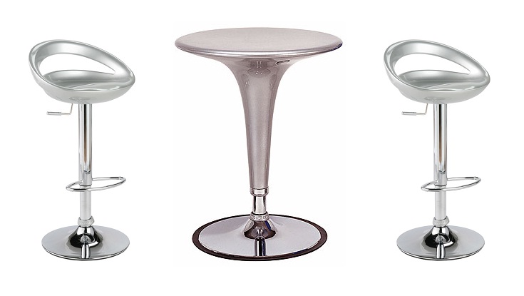 Комплект, барный стол, высота стола регулируется в 2 положениях, основа хромированная, столешница круглая, пластик, диаметр - 60 см, высота 68 - 90 см, 2 барных стула, основа стула хромированная, сиденье из пластика, регулируется по высоте от 61 до 83 см. |