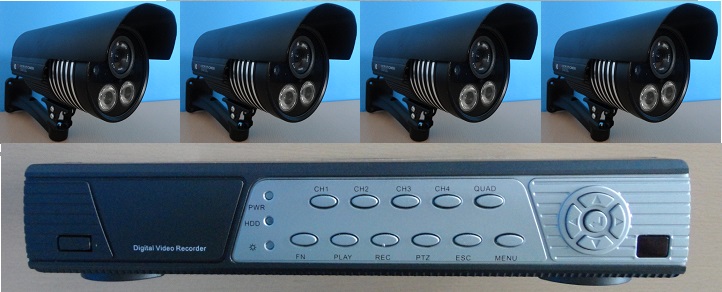 4 цветные, наружные камеры VI-N420IR2 с мощной ИК-подсветкой до 50 м, для просмотра длинных участков территории. Объектив f=8 мм , угол обзора до 23 градусов, матрица 1/3" Sharp (Япония). Система видеосигнала PAL, класс защиты IP66, кронштейн для настенной установки.