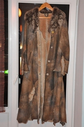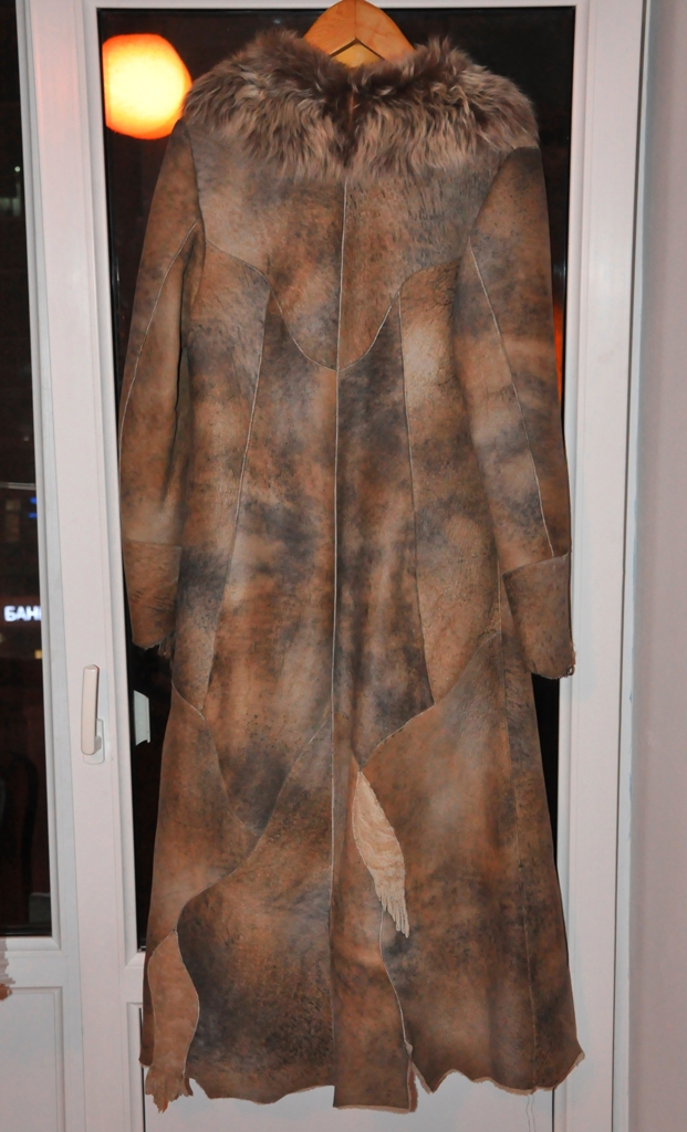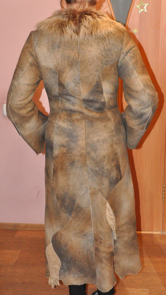 дубленка на козьем меху. размер S-M. длина 130 см, длина рукава 65 см. цвет коричнево-зеленый с серыми разводами, оторочка аппликацией на рукавах и по канту. хорошо ложится по фигуре, тонкая, но теплая, не создает впечатление раздутости. можно носить с поясом. ТОРГ! |