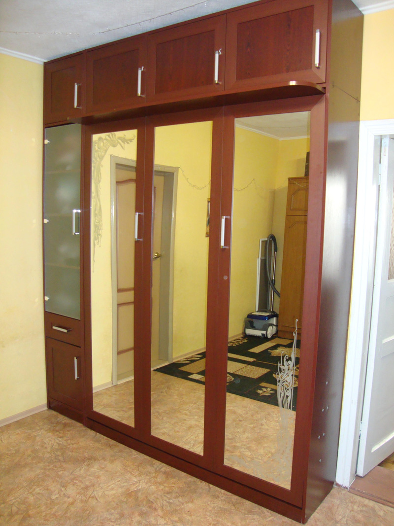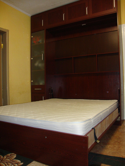 Шкаф кровать Цвет: Махонь. 3 зеркала (рисунок на 2-х зеркалах). Габаритные размеры (ВхГхШ): 267х45х220 Размер спального места: 160х200 Итальянский механизм подъема основания кровати. Ортопедическое основание под матрац. Ремни для пристегивания постельных принадлежностей. Вещевые шкафы. Вверху антресоль. Цена: 4500 грн. |