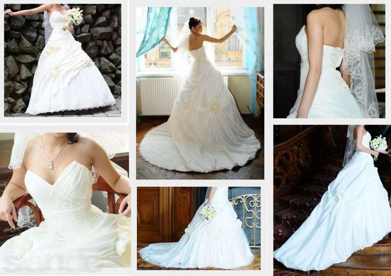Цвет – айвори (цвет шампанского). Верх платья – корсет с драпировкой, расшитый стеклярусом. На спинке завязывается на ленту. Низ платья – несколько слоев тафты, атласа и кружева. По подолу есть драпировки и красивые цветы из тафты. Шлейф длинный, можно подстегивать.