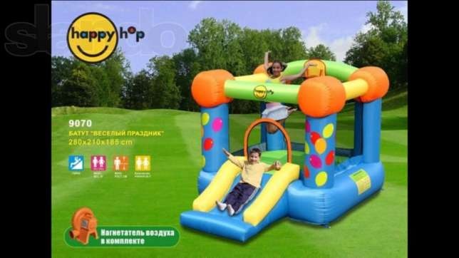 В комплект надувного аттракциона входят: надувной батут с горкой, вентилятор для надувания 220V; колышки пластиковые для крепления батута к грунту; паспорт-инструкция; сумка для транспортировки и хранения. Кратко о батуте надувном Happy Hop: имеет гарантированно высокое качество; надежен и безопасен; быстро устанавливается/сворачивается; может использоваться как домашних условиях, так и устанавливаться в парках, на морских пляжах и в других местах отдыха; вентилятор для надувания имеет низкий уровень шума. Размер: 280/210/185. Вес бутута-15,7кг. Максимальный вес игроков -120 кг. максимальный рост игроков 90-150см. |